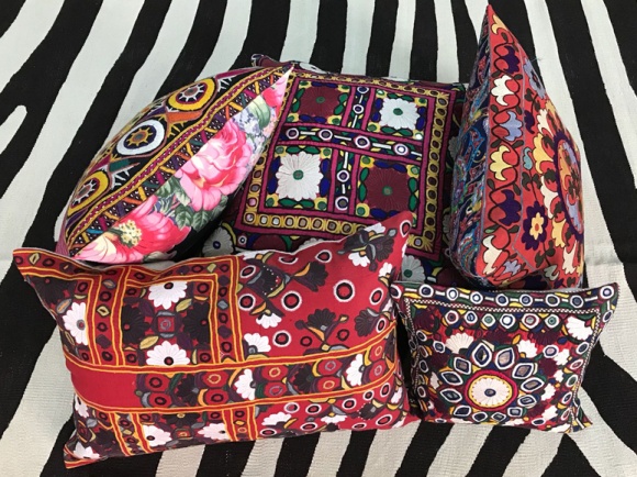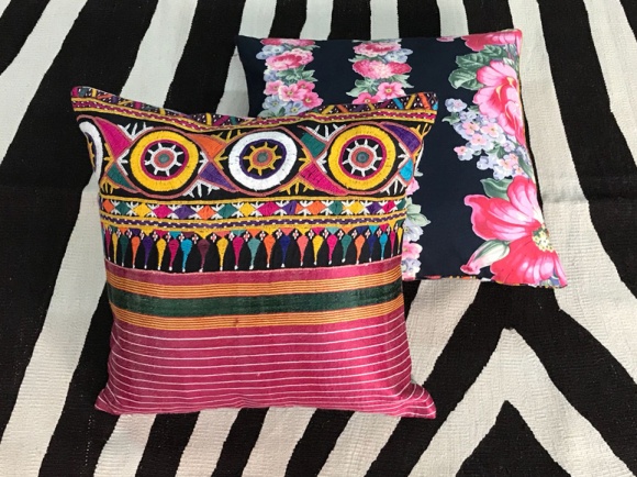 vintage embroidered Gujarat, India on silk mashru 18 x 18" reverse in tulu camille knife edge, hidden zipper *pillow inserts not included *FINAL SALE