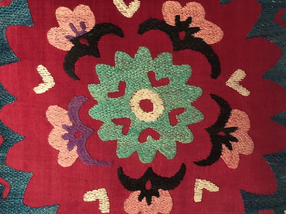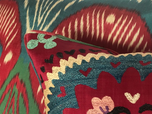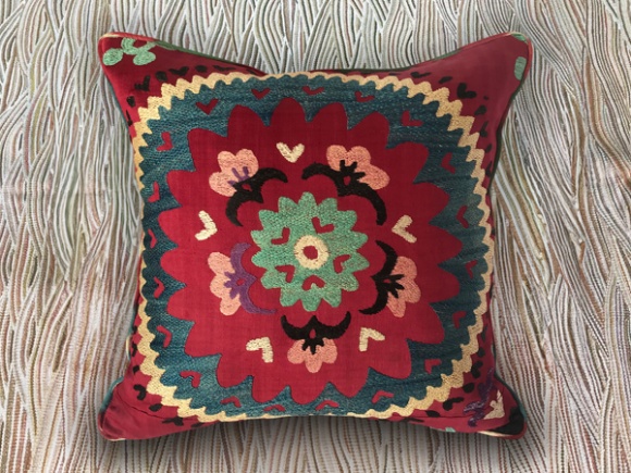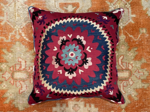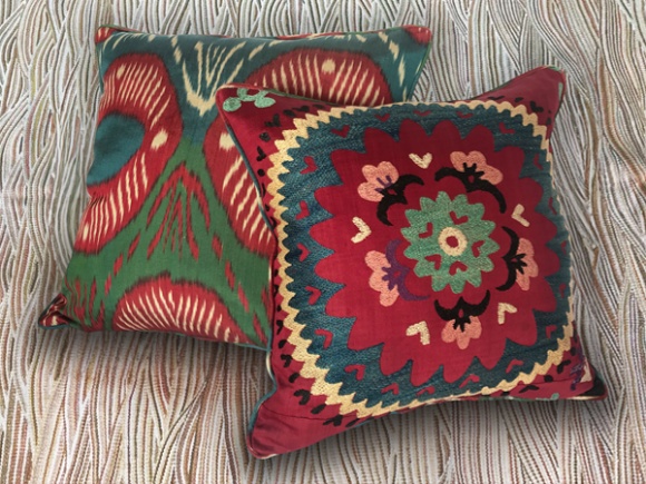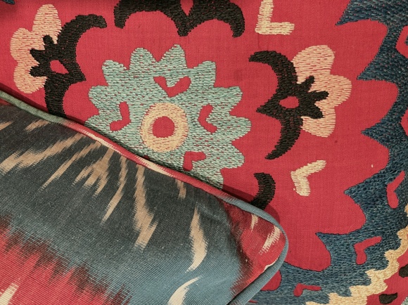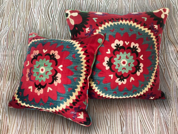vintage Uzbek suzani, 20x x20" and 24 x 24" reverse in Uzbek hand woven ikat piping edge, hidden zipper *pillow inserts not included *FINAL SALE