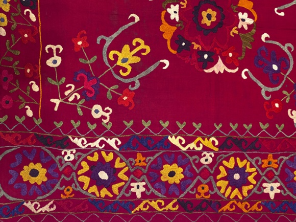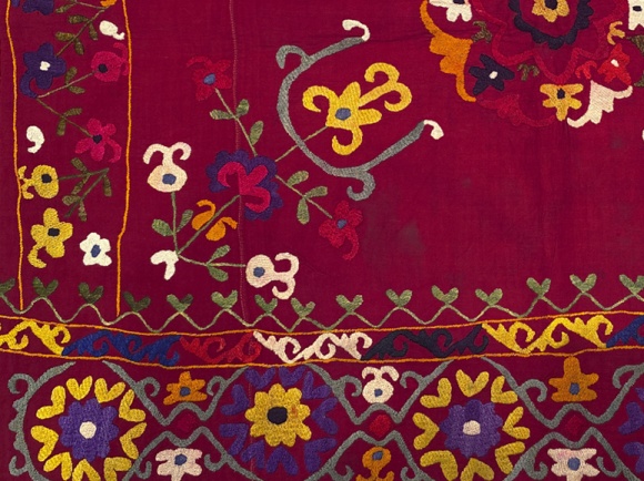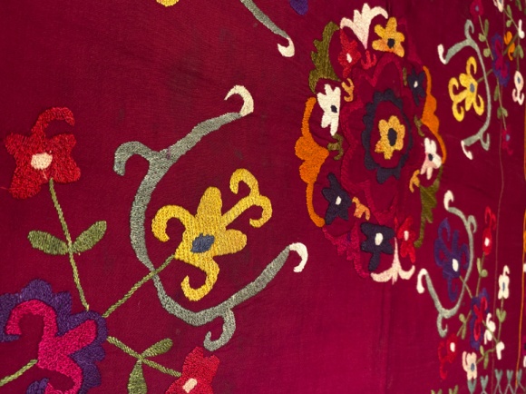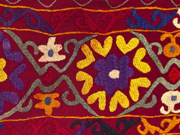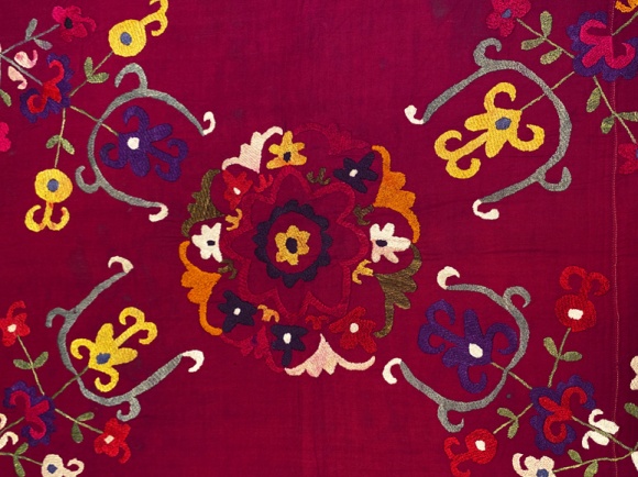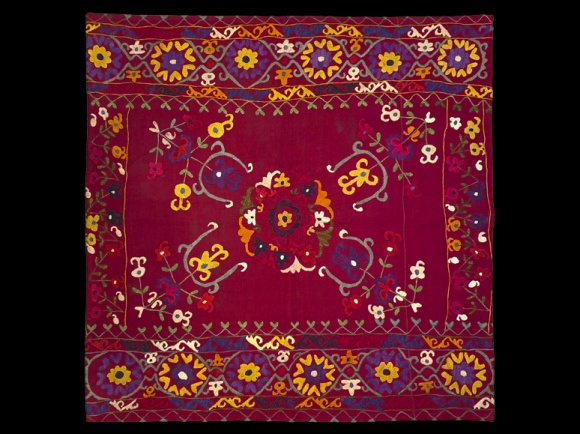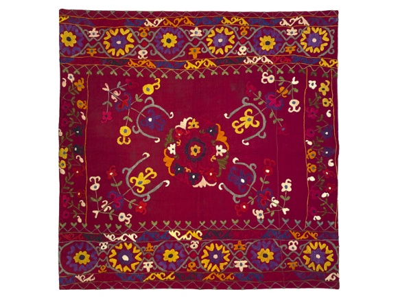 Uzbek suzani, embroidered silk on cotton base, good condition, 33" x 33" knife edge, hidden zipper insert not included *FINAL SALE